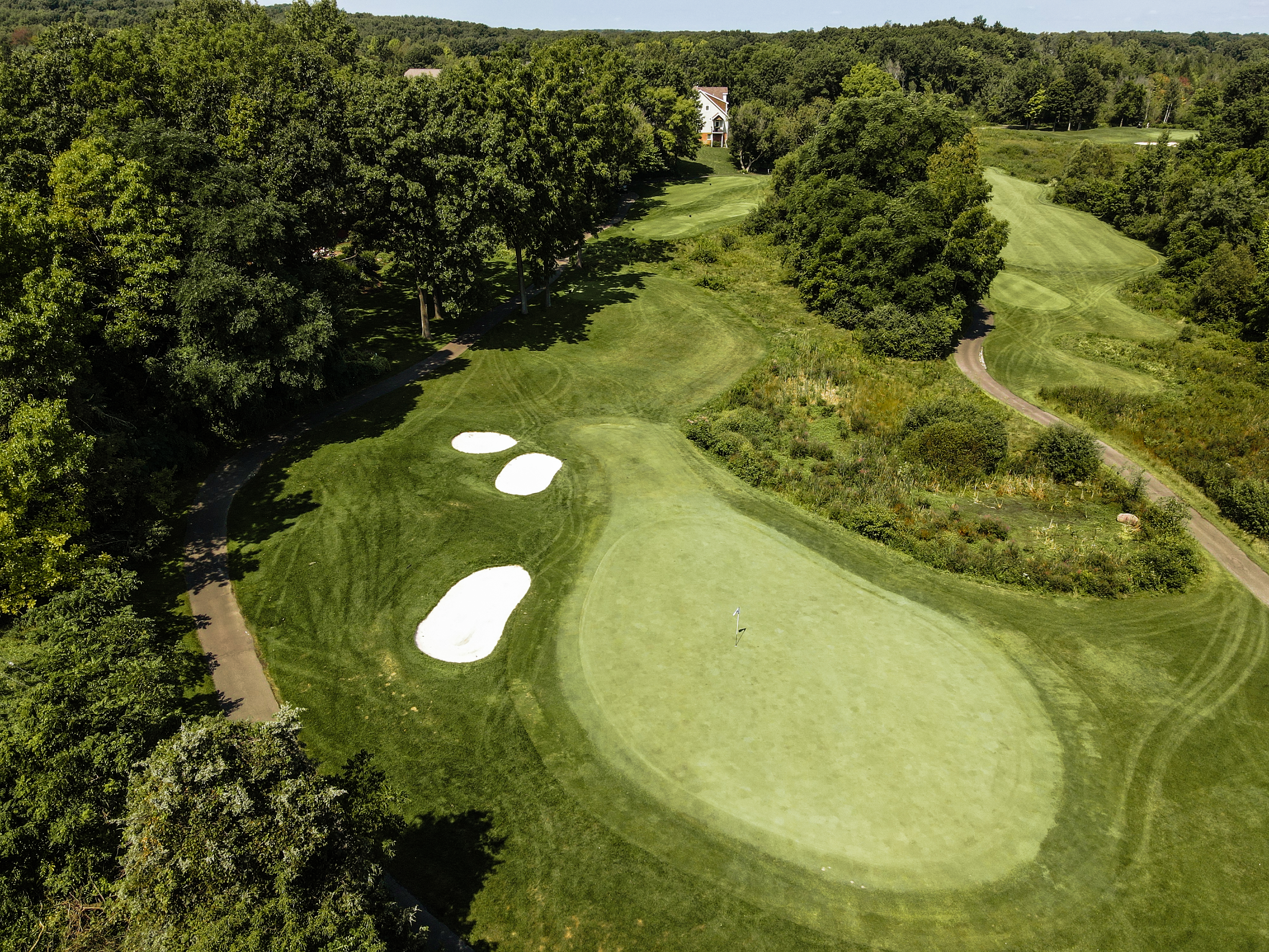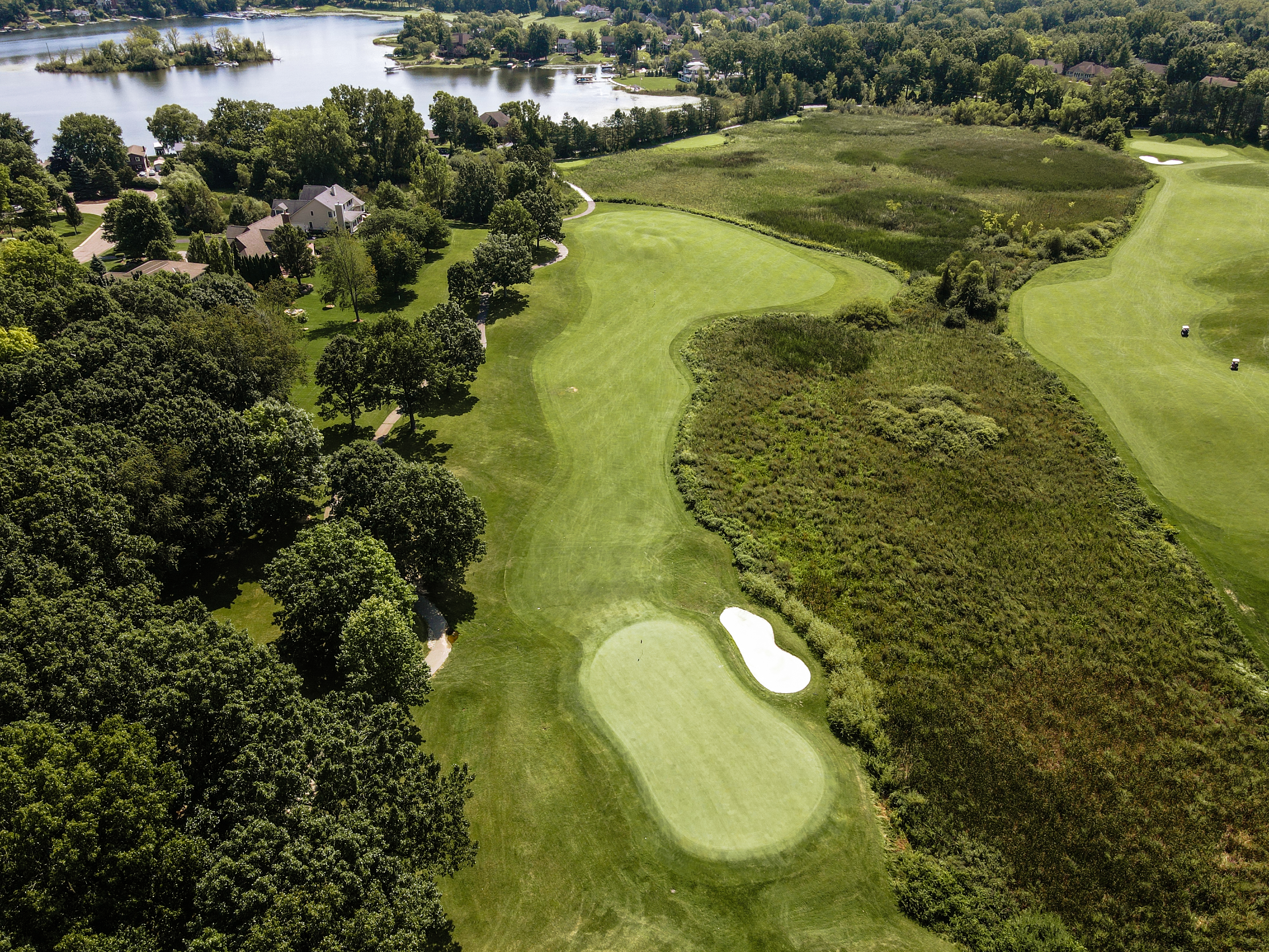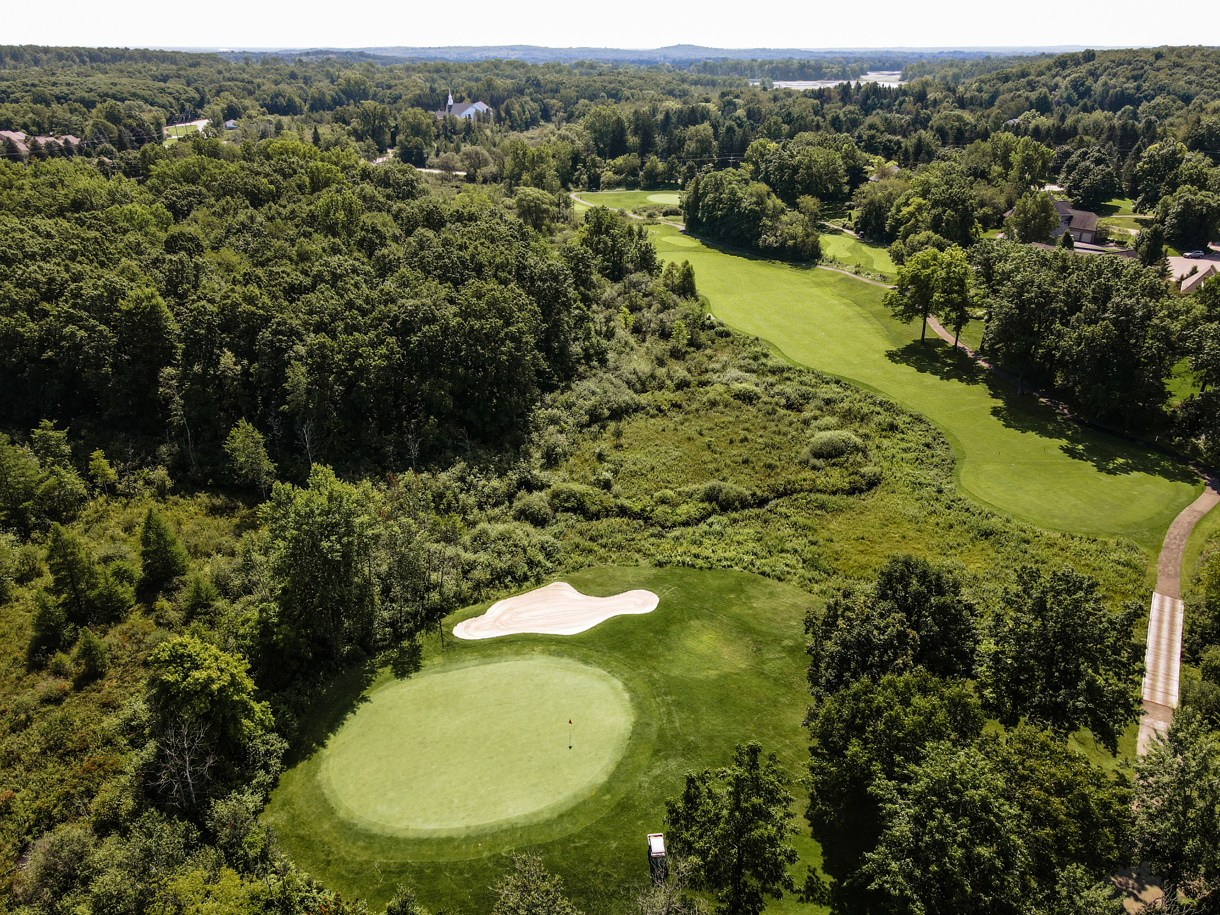 Walking up to the tee of this beautiful hole, Crooked Lake just beyond the flag stick creates a Scenic back drop. This green is protected by a front left bunker and another wrapping the backside of the green