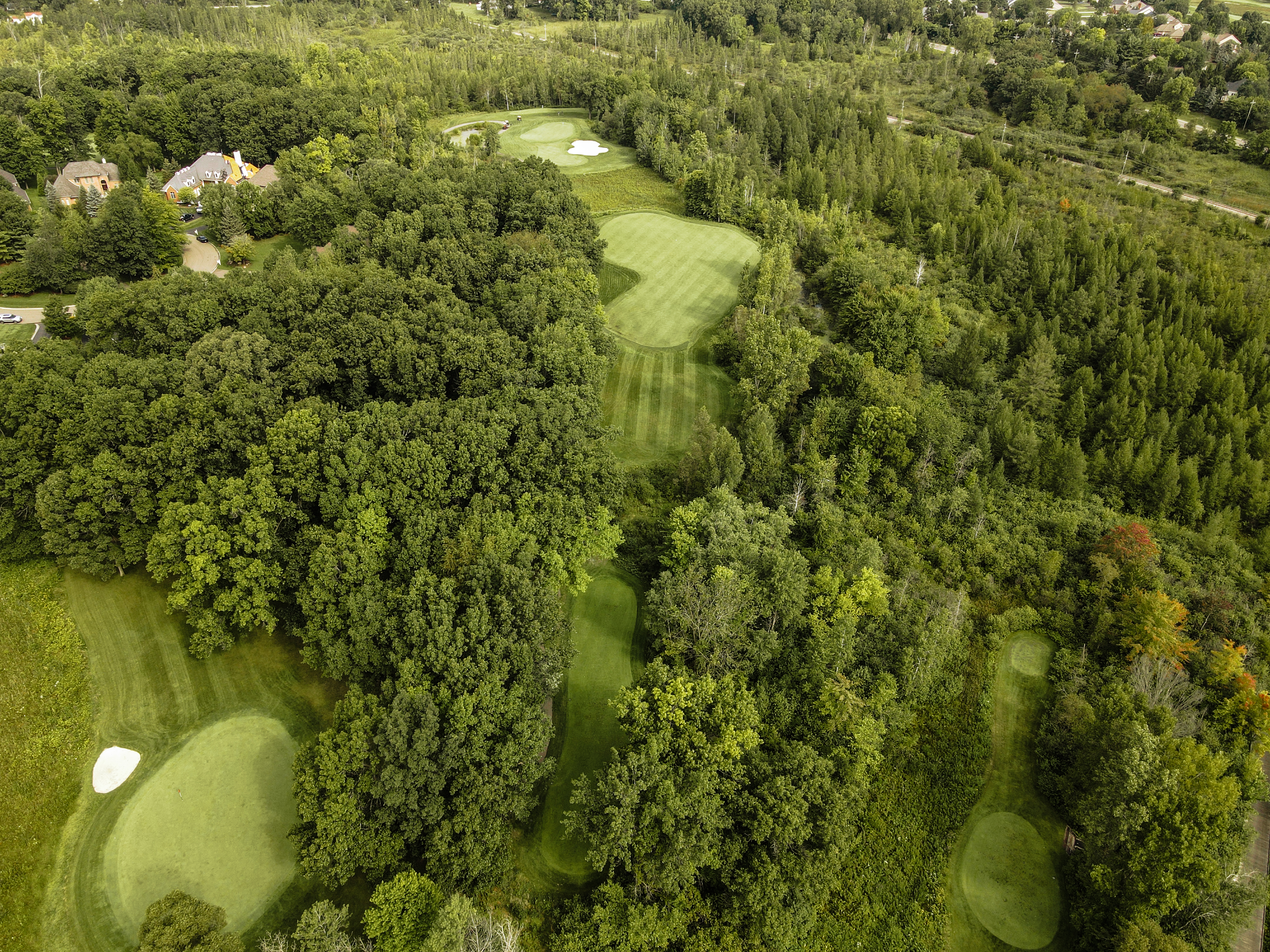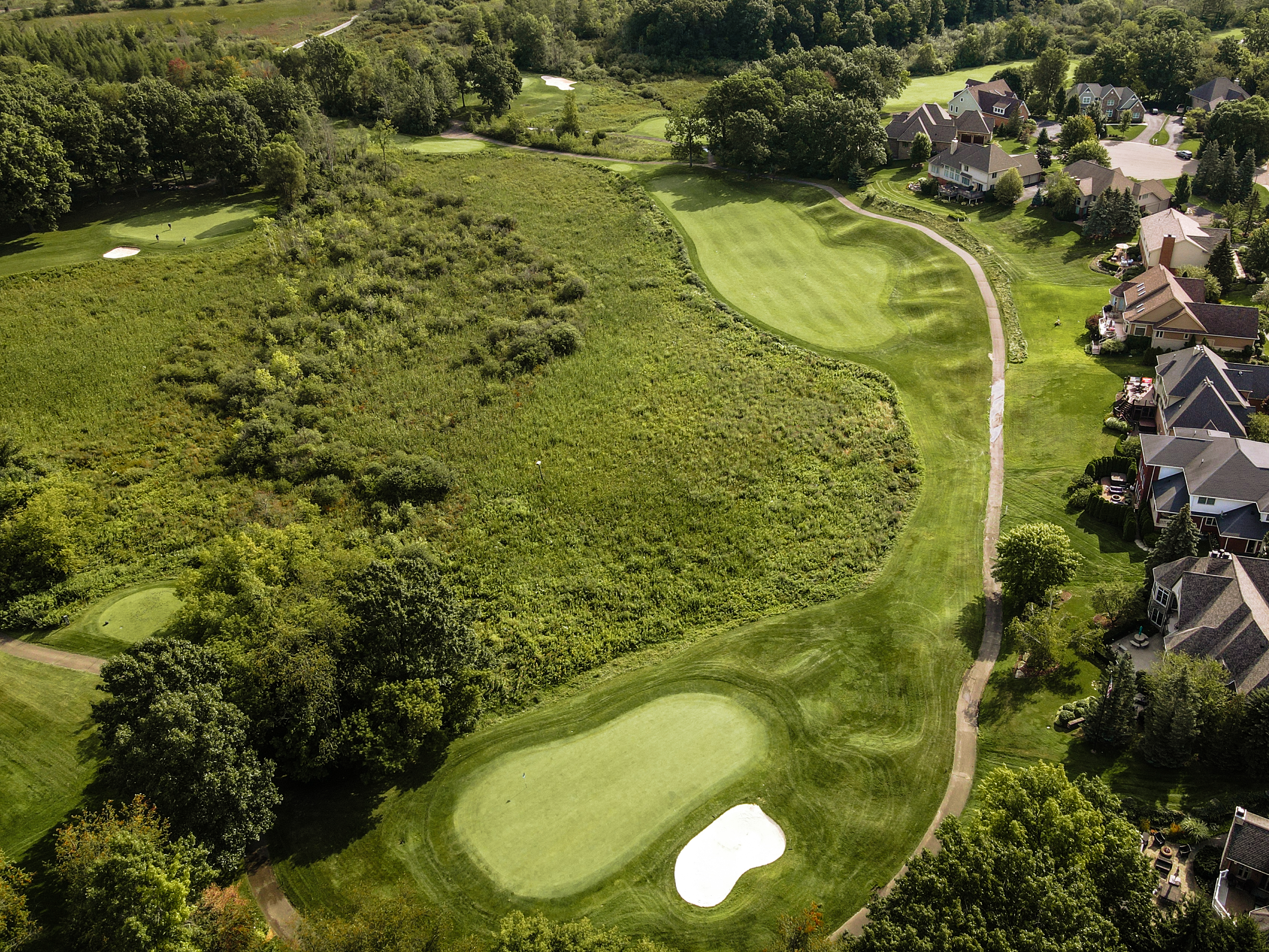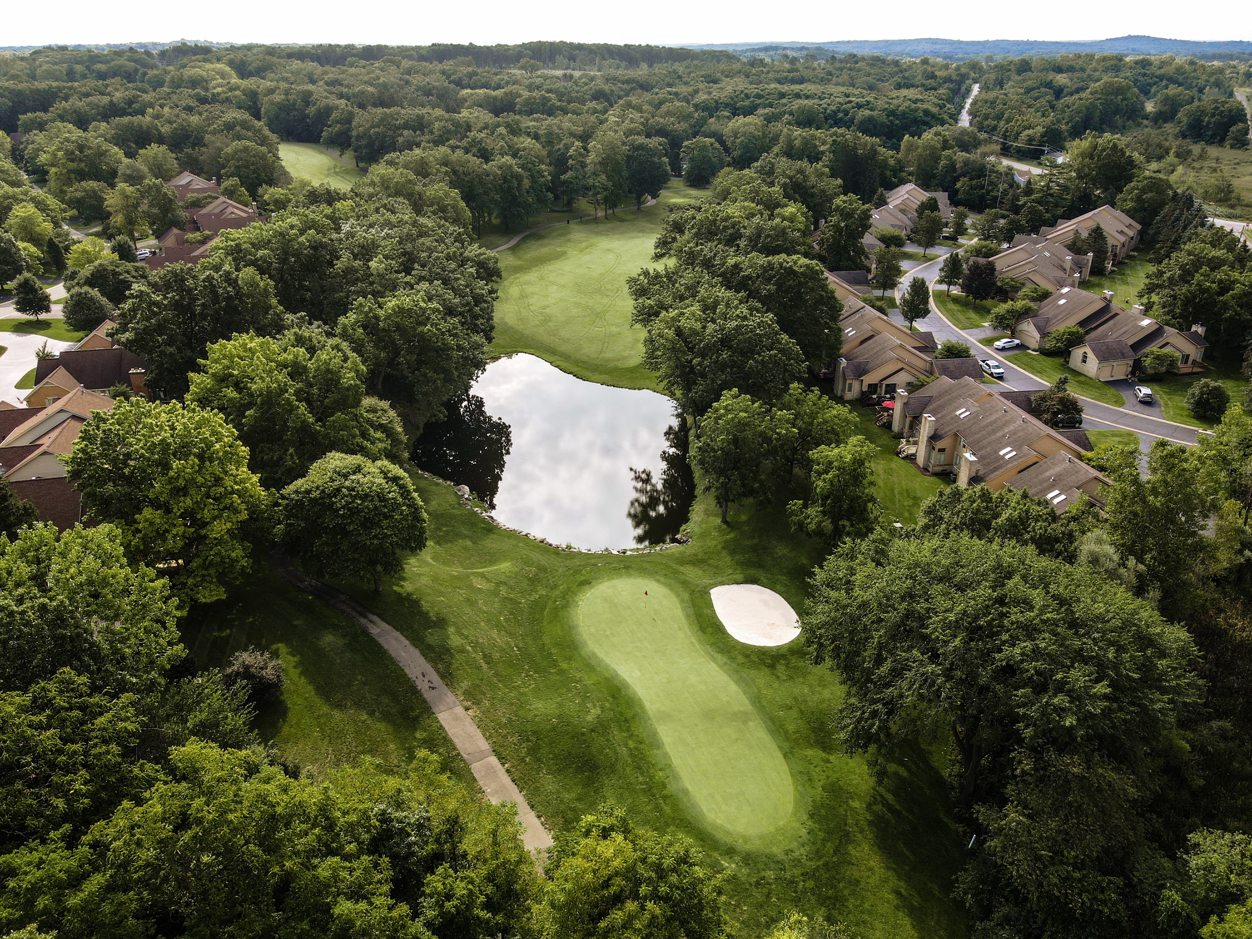 Walking up to the tee of this beautiful hole, Crooked Lake just beyond the flag stick creates a Scenic back drop. This green is protected by a front left bunker and another wrapping the backside of the green