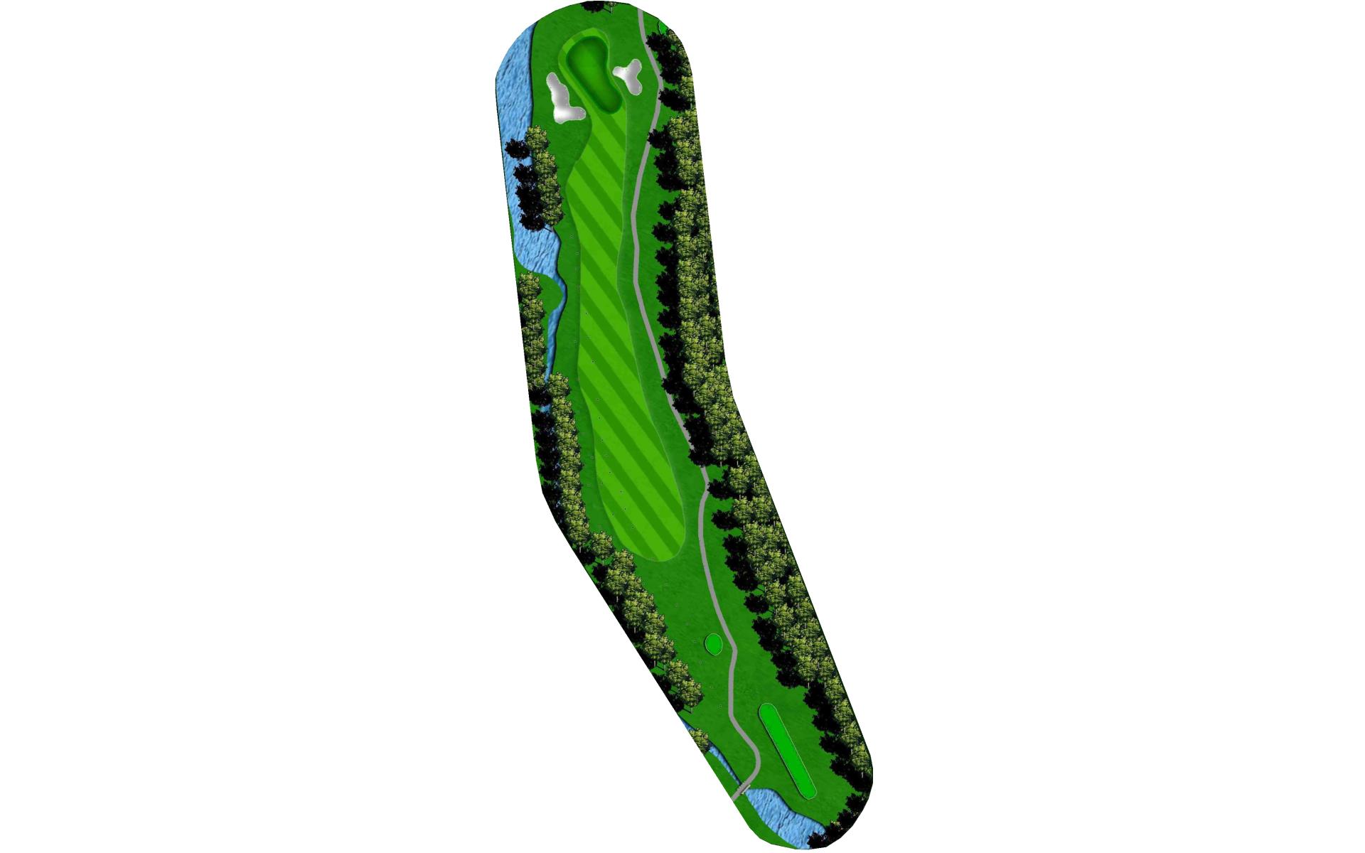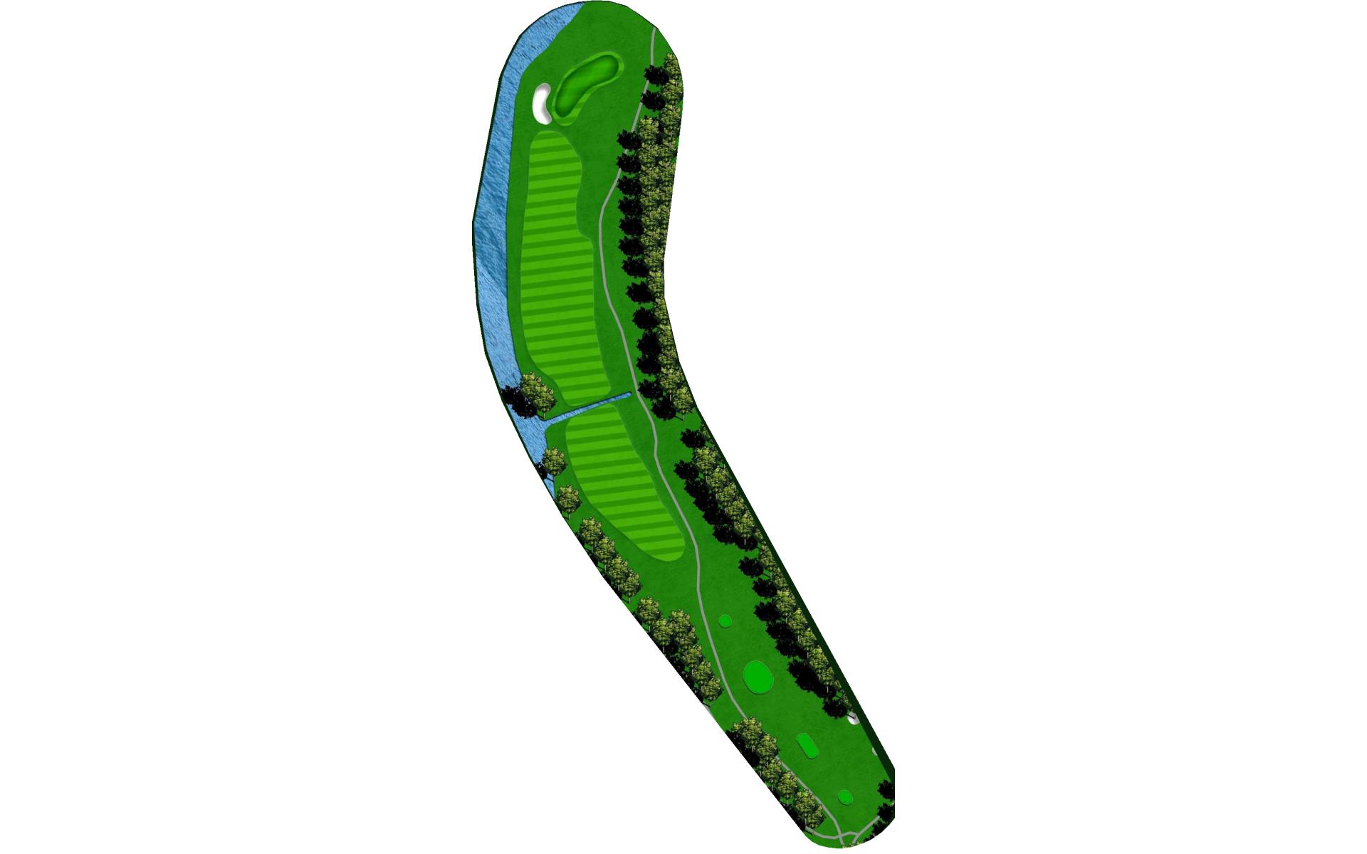 A Par 5, narrow looking tee shot with a penalty area left, past the tee shot the hole turns and opens. Grass mounds surrounding the green make for challenging pitch shots.