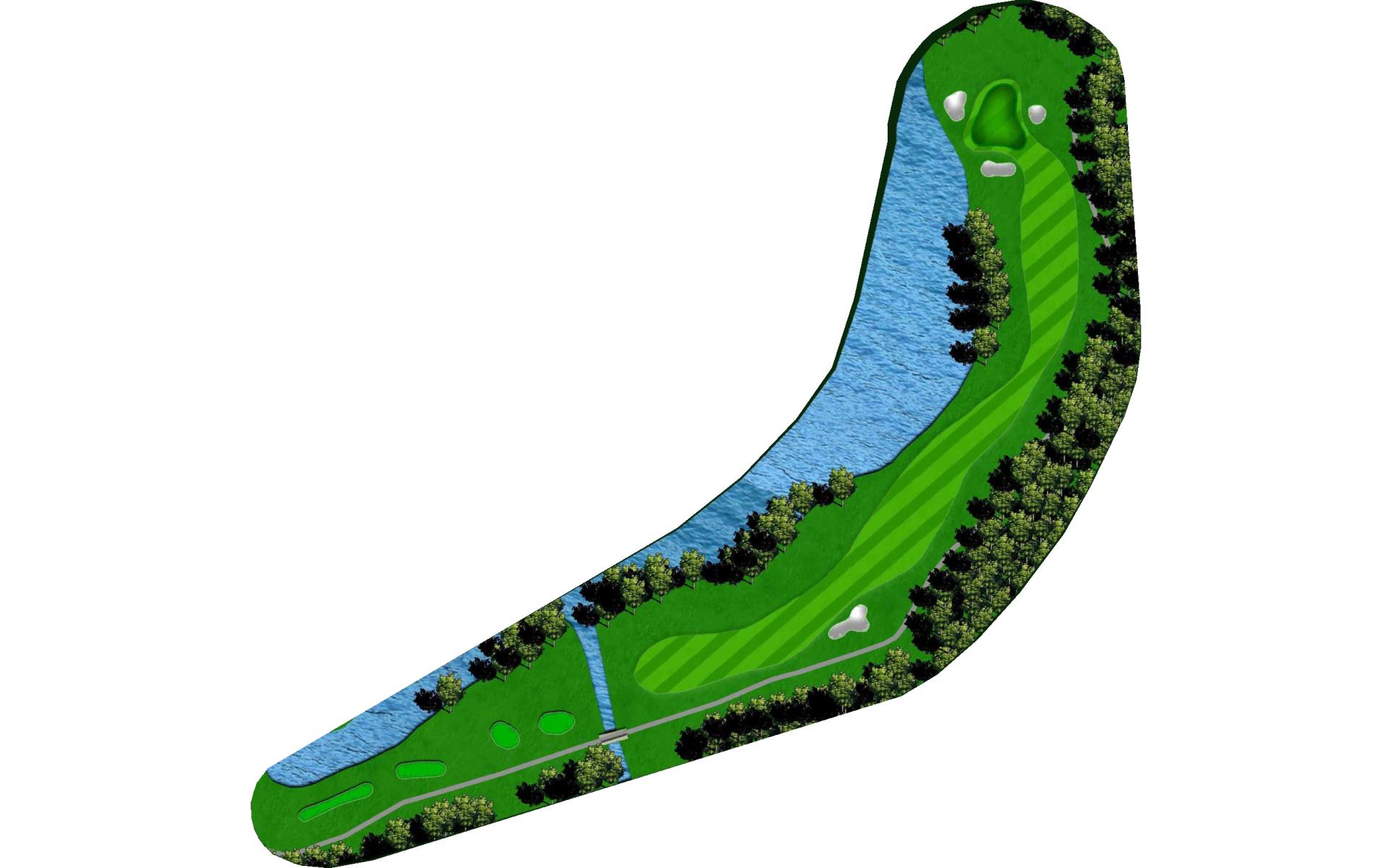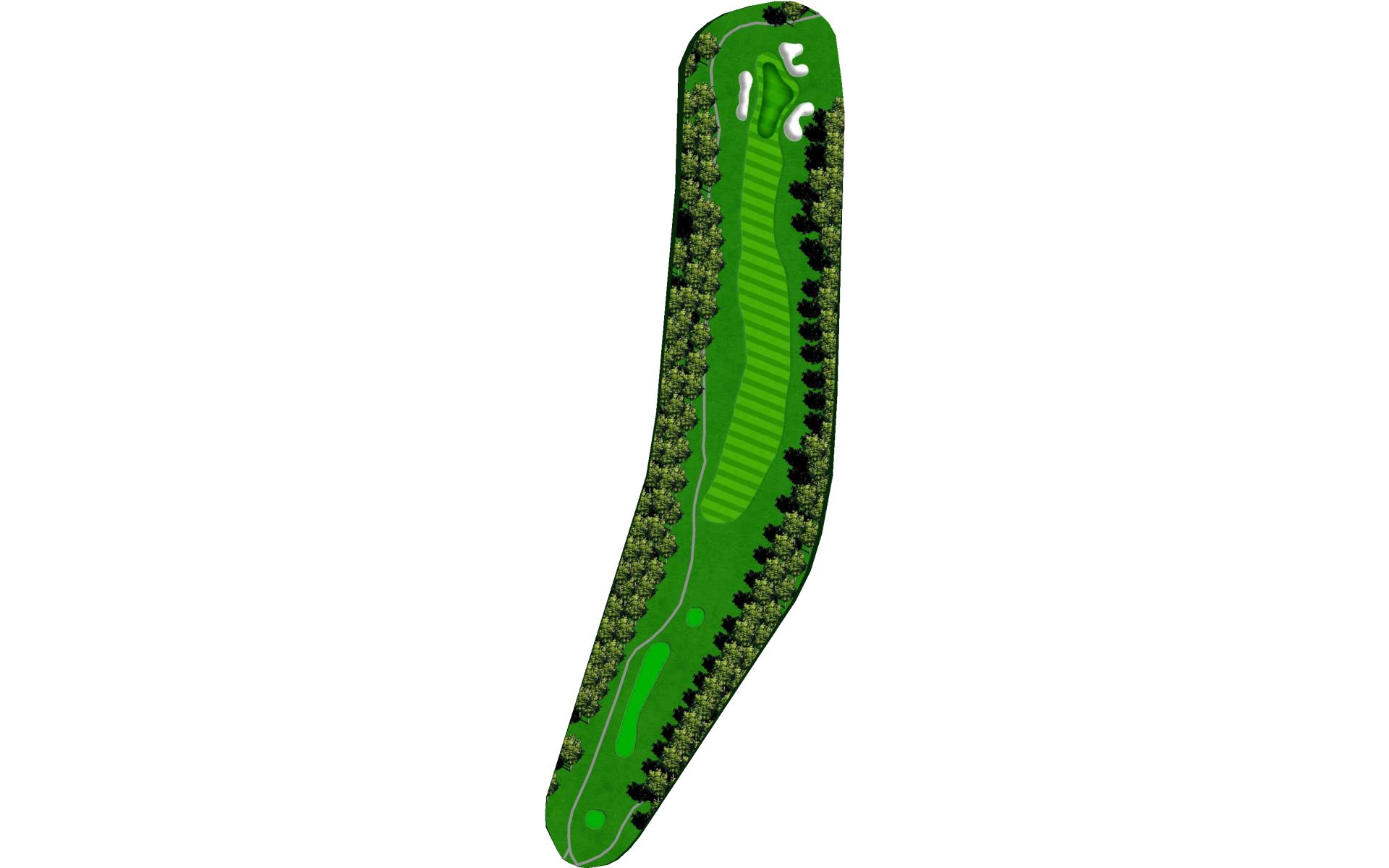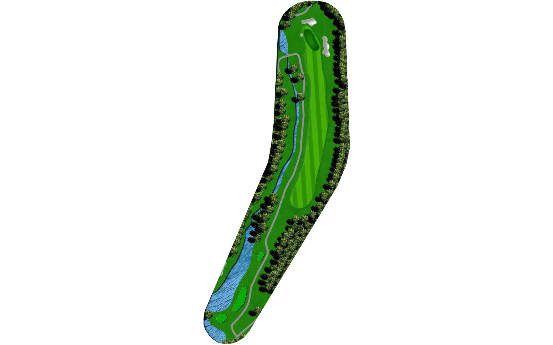 Par 5 that snakes around a huge water feature down the left side of the hole. Tall trees guard against long hitters against reaching the green in two, making the correct layup yardage critical.